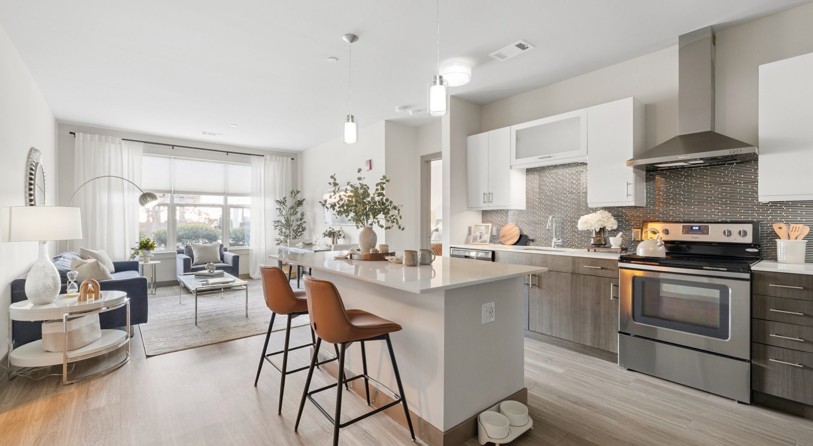 The deluxe apartment amenities at The Tremont represent indulgence, transforming from a mere option into a daily reality. We offer one-, two-, and three-bedroom floor plans, with sizable, pet-friendly units featuring abundant natural light, large windows, and 9-foot ceilings. Each living space has luxury plank flooring, quartz countertops, stainless steel appliances, and a stylish tile backsplash.
